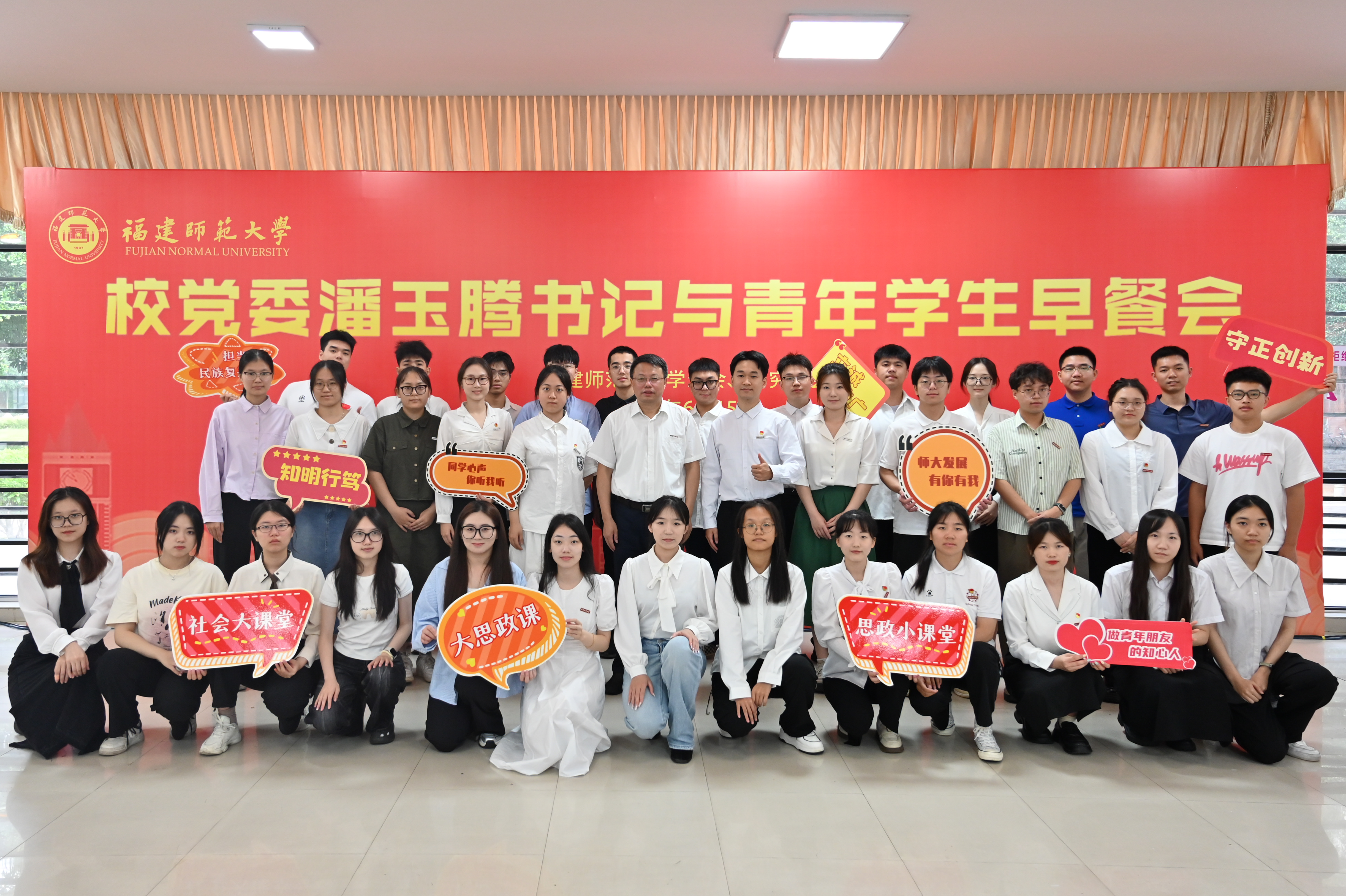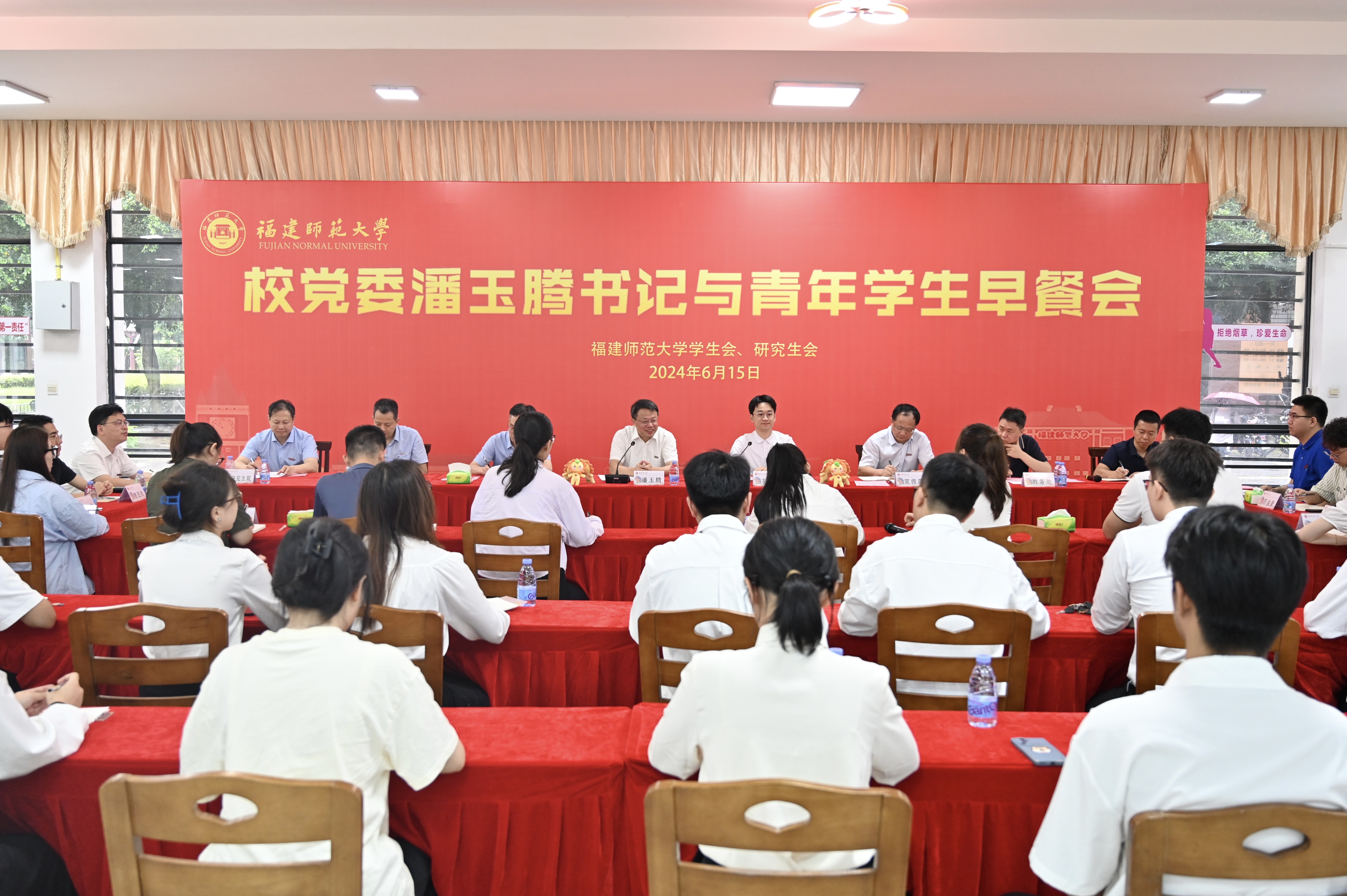 6月15日,由校学生会、研究生会主办的第十八期“校党委书记与青年学生早餐会”在旗山校区随园餐厅举行,校党委书记潘玉腾与学生代表围坐在一起谈体会、说心得、话成长。党政办公室、宣传部、学生工作部、教务处、研究生院、校团委、马克思主义学院等单位负责人、各学院学生代表参加活动。早餐会由校学生会卢锡标同学主持。