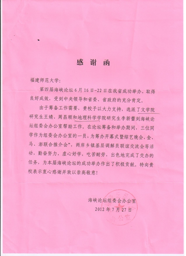 海峡论坛组委会致信感谢九游平台(中国)学生为第四届海峡论坛成功举办作出贡献