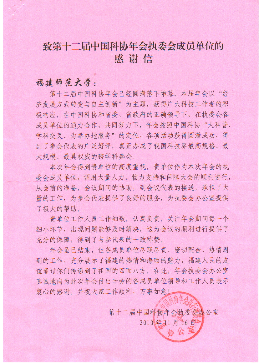 第十二届中国科协年会执委会办公室致九游平台(中国)感谢信