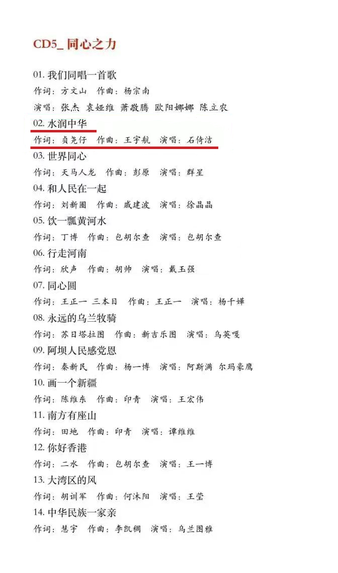 据悉,该精品集以中国共产党新时代新征程“强国建设、民族复兴”的中心任务为出发点,设9个主题篇章,共精选100余部优秀原创歌曲及器乐作品。《水润中华》入选精品集第五篇章《同心之力》,该篇章紧紧围绕铸牢中华民族共同体意识主线,用歌声描绘民族团结的“同心圆”,唱响新时代全党全国各族人民团结奋斗的乐章。该篇章的14首歌曲诠释了中华儿女的赤子深情,也鼓舞了每一位逐梦前行的中华儿女携起手来,在新时代高举旗帜,共创美好未来。