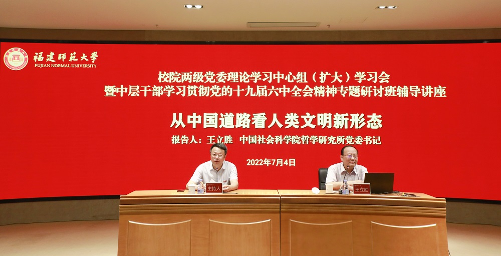 7月4日,校院两级党委理论学习中心组(扩大)学习会暨中层干部学习贯彻党的十九届六中全会精神专题研讨班辅导讲座在旗山校区宏达厅举行,中国社会科学院哲学研究所党委书记、副所长王立胜研究员应邀作辅导报告。报告会由校党委书记潘玉腾主持,校领导、机关部处和各二级党组织主要负责人在主会场,各二级党组织理论学习中心组成员、其他中层干部通过直播平台在分会场参加学习。