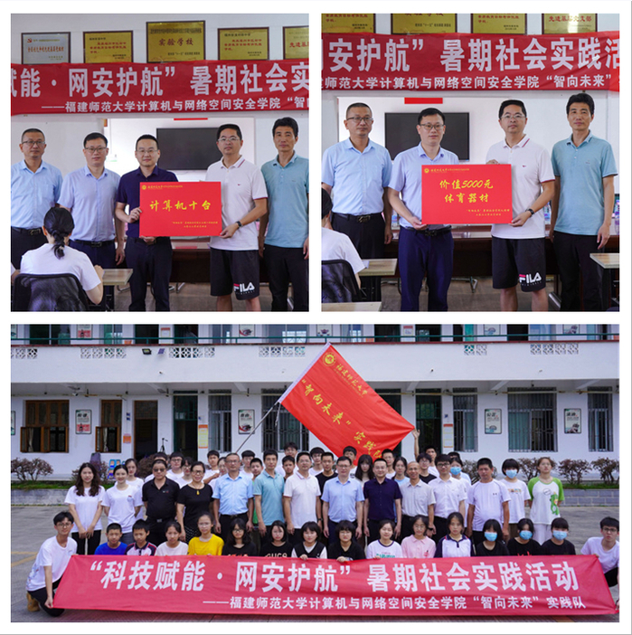 7月4日上午,计算机与网络空间安全学院“智向未来”实践队暑期社会实践活动开营式暨捐赠仪式在福州宦溪中学会议室举行。福州宦溪中学校长王世德、德育处主任赵茗,福州市传一卓跃智能科技有限公司总经理陈朝雄,福州市橄榄树公益服务中心理事长林向荣,学院党委副书记邓胜柱、团委书记李奇虎、实践队全体成员以及宦溪中学参营学员代表共40余人参加了此次仪式。