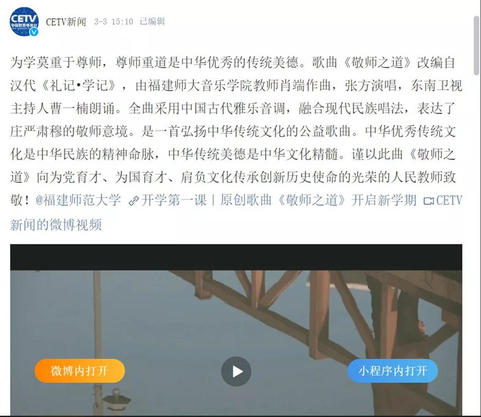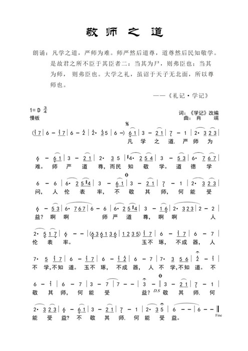 近日,由音乐学院教师肖端创作,张方演唱的《敬师之道》获中国教育电视台微博平台推送。歌曲《敬师之道》改编自汉代《礼记•学记》,由音乐学院教师肖端作曲、张方演唱,东南卫视主持人曹一楠朗诵。全曲采用中国古代雅乐音调,融合现代民族唱法,表达了庄严肃穆的敬师意境。歌曲分为两部分,男生朗诵部分铿锵有力,别有韵味;女生演唱部分曲调雅畅清逸,情感真挚。作品旨在弘扬尊师重道这一中华优秀传统美德。 (音乐学院)