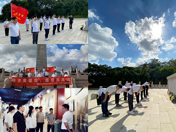 在泉州烈士陵园,实践队伍顶着骄阳,沿着陵园台阶拾级而上,为烈士们献上鲜花,用心感受烈士碑上“革命烈士 永垂不朽 功垂千秋 气贯长虹”十六个字背后的精神内涵。队员们在庄严的革命烈士纪念碑前集体默哀,列队瞻仰,深切缅怀革命先烈的丰功伟绩,深刻感悟艰苦卓绝的革命历程。悼念结束后,实践队在烈士纪念碑前重温入党誓词,用铮铮誓言缅怀革命烈士的英雄事迹。“我志愿加入中国共产党,拥护党的纲领……”铿锵的誓言回荡陵园上空,实践队成员受到了一次深刻的精神洗礼。
