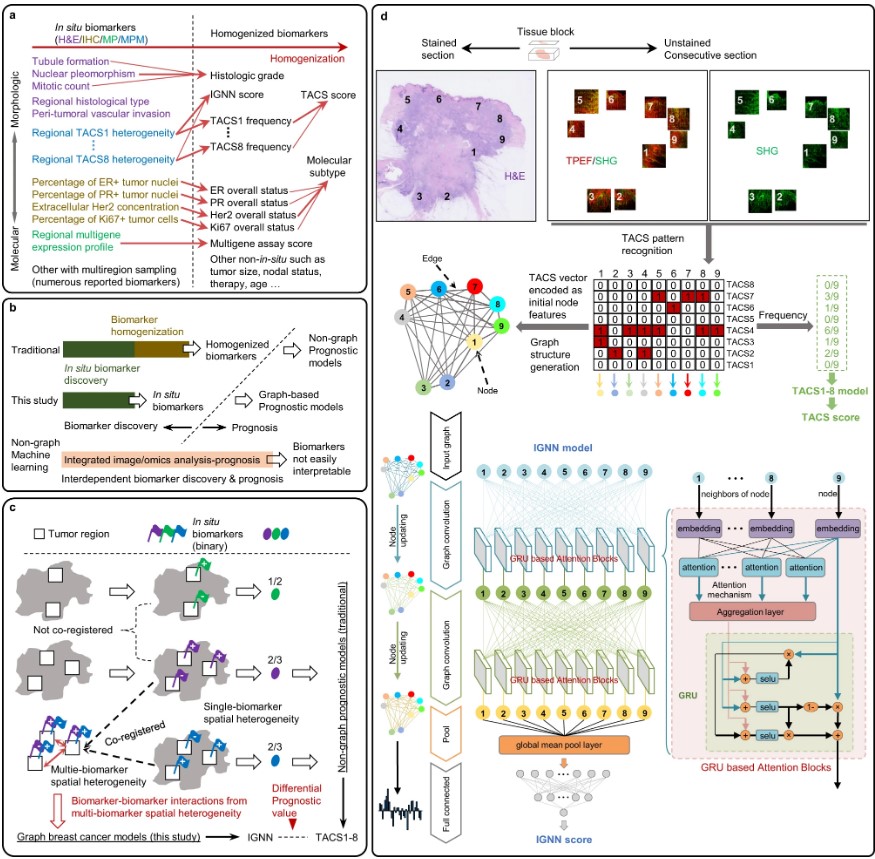 近日,九游平台(中国)光电与信息工程学院陈建新教授、李连煌博士课题组与美国伊利诺伊大学厄巴纳-香槟分校涂浩华博士课题组合作,在乳腺癌预后预测研究领域取得重要进展。课题组开发了一种用于乳腺癌预后预测的瘤内图神经网络模型IGNN,建立了针对不规则非欧几里德数据的描述和分析范式,并将其用于挖掘和解释异质性乳腺肿瘤中多个区域的原位生物标志物之间隐含的预后相互作用。与目前在计算病理学中被广泛采用的通过推理获得预后特征的各种机器学习模型不同,IGNN不依赖于特定的原位生物标志物,通过对从多光子显微成像获得的肿瘤相关胶原特征(TACS1-8)进行图结构化编码和分析,IGNN揭示了异质性TACSs的潜在预后价值,实现准确和可解释的乳腺癌预后预测。