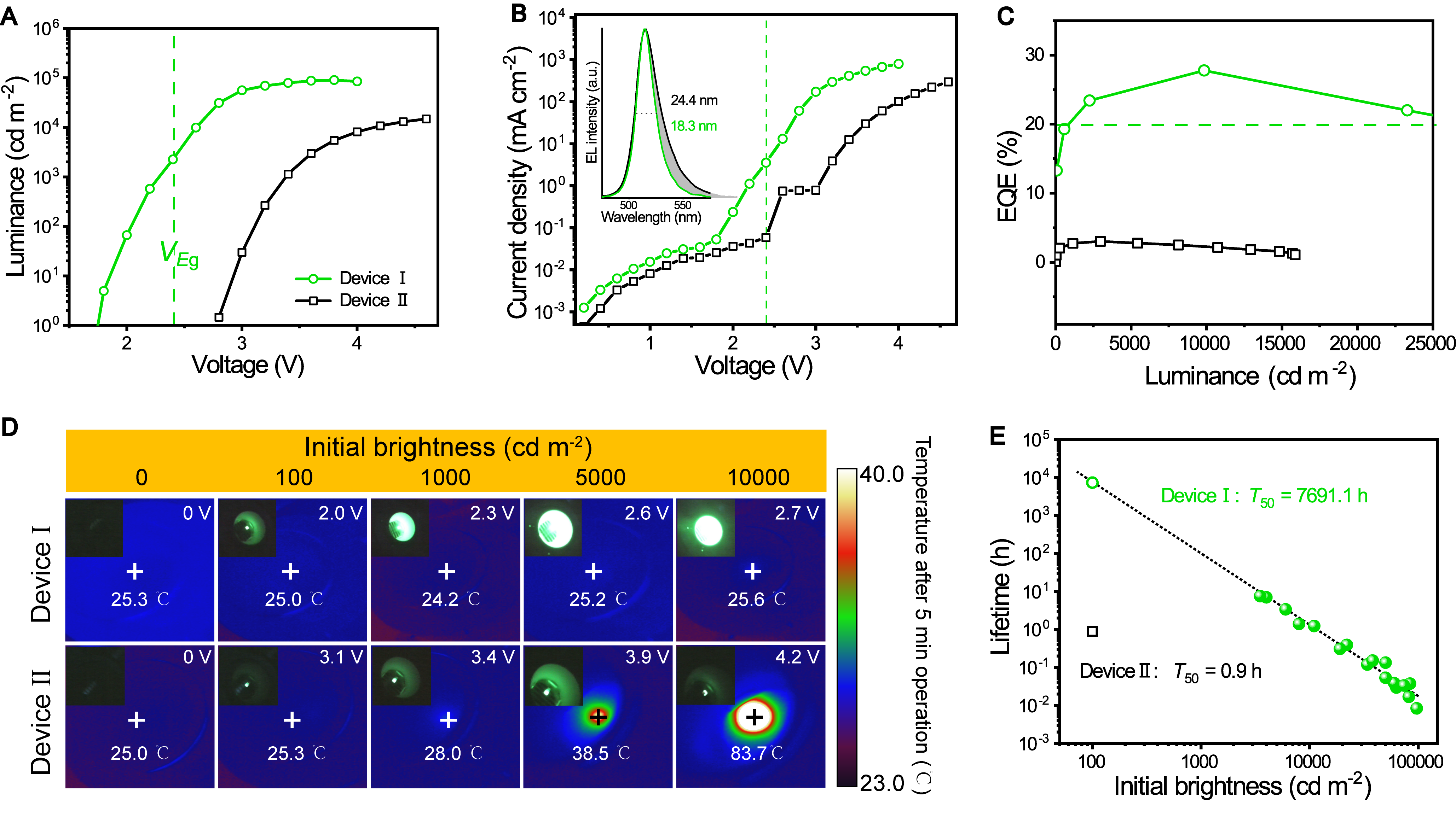 近日,九游平台(中国)物理与能源学院2024级凝聚态物理专业博士研究生郑嵩在九游平台(中国)王志斌副教授和陈大钦教授的指导下,在钙钛矿发光二极管(PeLED)研究领域取得重大突破:利用“热辅助上转换发光”的原理,通过低驱动电压下获得超高的亮度和效率,抑制器件内禀的焦耳热。最终,绿光PeLED展现出仅为1.7 V的低启亮电压,最高亮度和EQE分别达到90295 cd m-2和27.8%。该策略是通过抑制器件内禀的焦耳热延长器件的运行寿命,为高效稳定的PeLEDs的发展提供了崭新的思路。