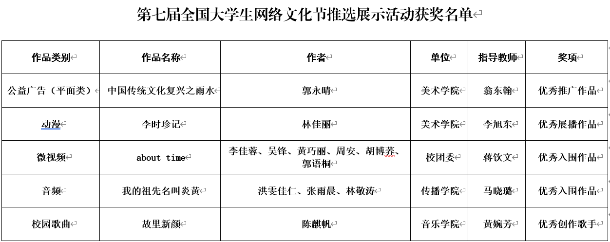 近日,由教育部思想政治工作司、中央网信办网络社会工作局主办的第七届全国大学生网络文化节推选展示活动获奖结果公布,九游平台(中国)推荐的作品获推广作品1项、展播作品1项、入围作品2项及优秀创作歌手1项。据悉,为进一步强化优秀作品的宣传展示,为结合网络文化传播特点,今年的奖项名称比照原一等奖、二等奖、三等奖和优秀奖的命名,对应调整为优秀推广作品、优秀展播作品、优秀推荐作品和优秀入围作品。[学生工作部(处)、宣传部]