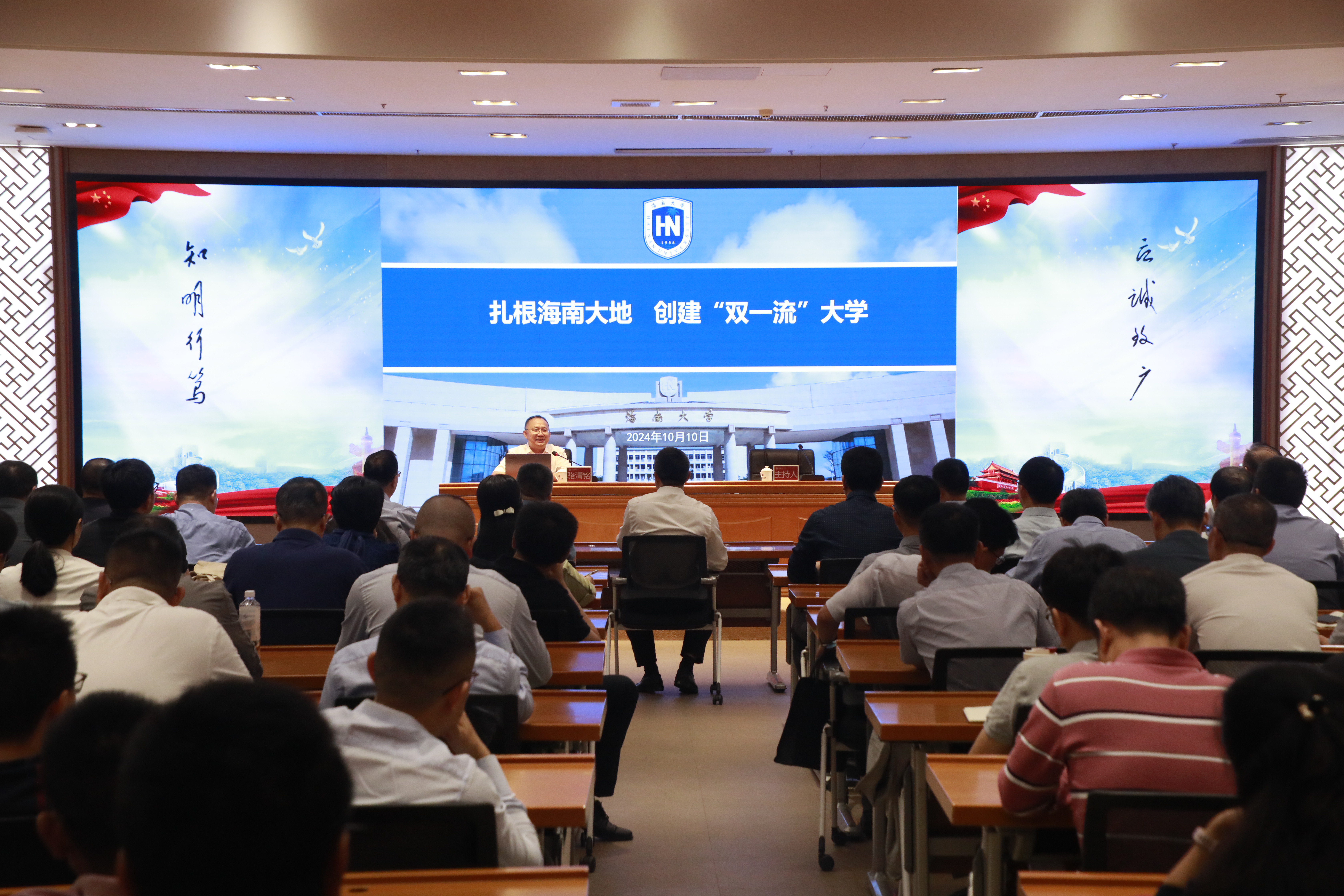 10月10日,校院两级党委理论学习中心组(扩大)学习会在旗山校区宏达厅举行,仓山校区科学会堂设分会场。会议邀请中国科学院院士、海南大学校长骆清铭作题为“扎根海南大地 创建‘双一流’大学”的辅导报告。海南大学副校长李步洪,校领导和全体中层干部参加学习。报告会由校党委书记潘玉腾主持。
