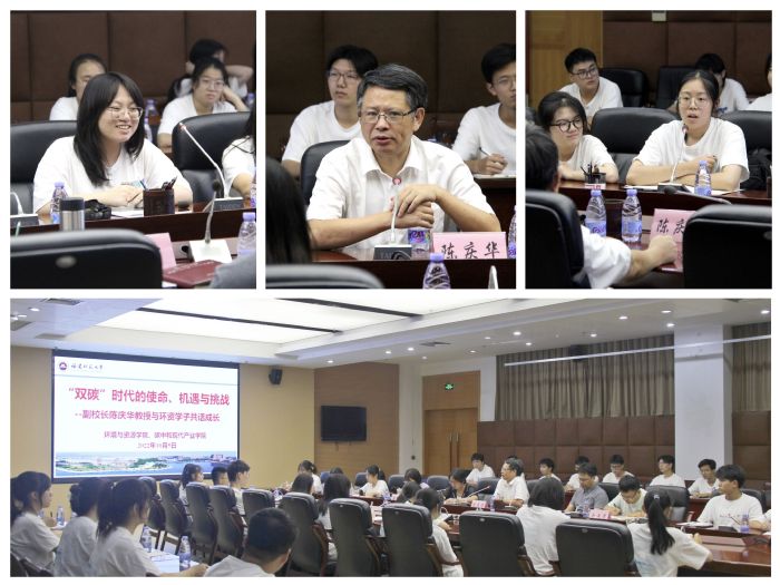 10月5日,副校长陈庆华与环境与资源学院、碳中和现代产业学院2021级环境工程班学子进行座谈交流,校产教融合中心、环资学院党政领导、班主任和辅导员等参加了活动。