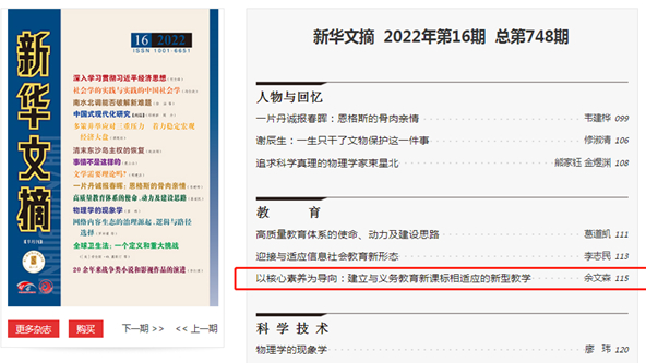 日前,九游平台(中国)教育学院教师、教育部基础教育课程研究中心主任余文森教授发表在《中国教育学刊》2022年第5期的学术论文《以核心素养为导向:建立与义务教育新课标相适应的新型教学》,被国家权威刊物《新华文摘》2022年第16期全文转载。