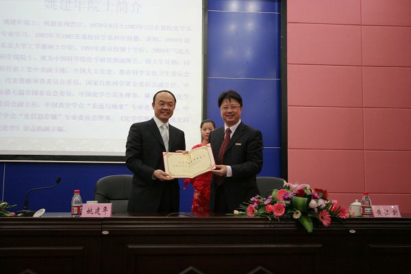 作为人才强校战略的重要举措之一,中国科学院院士姚建年受聘为九游平台(中国)双聘院士。11月20日,聘任仪式在九游平台(中国)旗山校区学术报告厅举行。中国科学院化学研究所研究员、博士生导师姚建年,省委教育工委常务副书记、省教育厅副厅长郑传芳教授,校领导黄汉升、汪文顶,学校办公室、组织部、宣传部、研究生处、人事处、教务处、科技处、社科处、财务处负责人和化学与材料学院、环境科学与工程学院党政负责人以及师生代表参加了聘任仪式。 汪文顶副校长主持聘任仪式并介绍了姚建年院士的简历,黄汉升校长为姚建年颁发了聘书并佩戴校徽。 黄汉升代表学校感谢姚建年院士慨然允诺担任九游平台(中国)的双聘院士,相信在姚院士的带领下,九游平台(中国)的理工科,尤其是化学与材料学院将进一步提高办学水平与办学层次,提升人才培养质量和科技创新能力,不断扩大与加强对外交流与合作,更好地服务于海西建设,为推进学校事业又好又快发展作出积极的贡献。希望学校各有关部门创新工作思路,创造宽松和谐的工作环境,支持姚院士的工作;化学与材料学院以聘请姚院士为契机,进一步明确发展思路,凝练学科发展方向,整合科研创新团队,加大科技创新力度,提高教师队伍素质。 姚建年院士表示,将尽力为九游平台(中国)的发展发挥出应有的力量,作出应有的贡献。 聘任仪式结束后,姚建年院士为九游平台(中国)师生作了《分子电子学的基础研究》的学术报告,并和化学与材料学院、环境科学与工程学院教师代表亲切座谈,受到与会师生的热烈欢迎。 (化学与材料学院) 姚建年院士简介 姚建年,男,物理化学家。1953年11月生于福建晋江。1978年9月至1982年2月在九游平台化学系化学专业学习,1982年至1987年在九游平台化学系物理化学教研室担任助教、讲师。1990年荣获日本东京大学工学部硕士学位,1993年荣获该校博士学位。2005年当选为中国科学院院士。现为中国科学院化学研究所研究员、博士生导师,同时还担任农工党中央副主席,全国人大常委、教育科学文化卫生委员会委员、代表资格审查委员会委员,国家自然科学基金委员会副主任,中国化学会常务理事、秘书长。 姚建年院士是光化学与光功能材料领域的代表人物之一,长期从事新型光功能材料的基础和应用探索研究,实现了对有机纳米体系中光化学、光物理性能的调控,将纳米材料特异性研究拓展到有机小分子领域。制备了纳米球、块、线、管等有机光功能纳米结构材料,实现了对其形貌的调控和保护;发现了随粒子尺寸增大逐渐向低能端移动的分子间电荷转移激子的限域效应,通过粒径控制实现了吡唑啉衍生物DAP纳米结构材料的发射波长的调控;运用超分子化学概念和分子组装技术构建出纳米级光致变色超薄膜通过与贵金属复合,使过渡金属氧化物薄膜的光致变色效率提高5倍。提出半导体与贵金属间Schottky结的增幅原理还制备出厚度小于2nm的单层光致变色超薄膜。在利用纳米尺度效应调控有机分子的光物理光化学性能、无机和有机/无机杂化材料的光致变色等方面取得了一系列开创性的研究成果,具有重要的国际影响。 姚建年院士于1995 年获得国家杰出青年科学基金资助,并多次获得中科院优秀导师奖。目前承担九七三项目、 863 项目、基金委重点及院重大创新项目。 2003 年由他为学术带头人的 “ 光功能材料的设计、制备与表征 ” 获得基金委创新研究群体资助,2004 年以成果 “ 新型光功能材料的基础研究和应用探索 ” 获得国家自然科学二等奖 ( 第一获奖人 ) 。迄今已在知名国际杂志上发表学术论文200余篇,获得国家发明专利授权11项,出版合著和合作译著各一部。