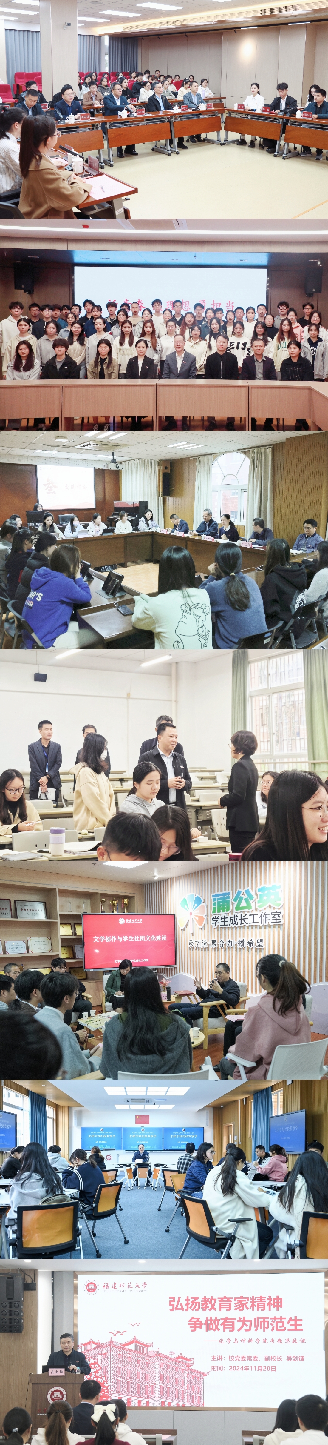 校党委书记潘玉腾走进马克思主义学院2023级思想政治教育专业二班和福建省习近平新时代中国特色社会主义思想大学生研习社(九游平台),开展“凝心聚力担使命 知行合一强根基”主题座谈会;校长王长平参加数学与统计学院2023级数学实验班“话青春 谈理想 勇担当”主题班会,并为学生上思政课;校党委副书记陈晓红参加音乐学院2022级音乐学(国家人才培养基地)班“温暖·安全·成长”主题班会;校党委副书记涂荣深入经济学院2021级经济学(国家人才培养基地)班看望毕业班同学并随堂听课;副校长郑家建与文学院2022级汉语言文学(师范)五班及文学社师生代表开展“文学创作与师范生素质提升”主题座谈会;校纪委书记林月恩为法学院、纪检监察学院2022级纪检监察实验班同学们讲授“怎样学好纪检监察学”专题思政课;副校长吴剑锋为化学与材料学院2023级化学(师范)班学生讲授“弘扬教育家精神,争做有为师范生”专题思政课。
