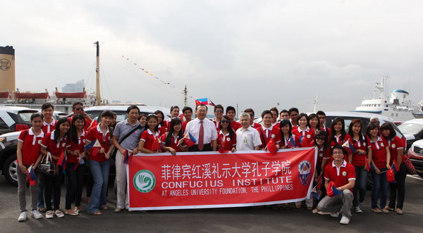 上午九点,由“马鞍山”号、“温州”号导弹护卫舰和“千岛湖”号综合补给舰组成的525护航编队缓缓驶入马尼拉南港13号码头,红奚礼示大学孔子学院大学生身着鲜艳的孔院制服,站在迎接队伍的最前列,手挥中菲国旗,齐声高呼“你好”、“欢迎”, 成为迎接队伍中一道最亮丽的风景线。