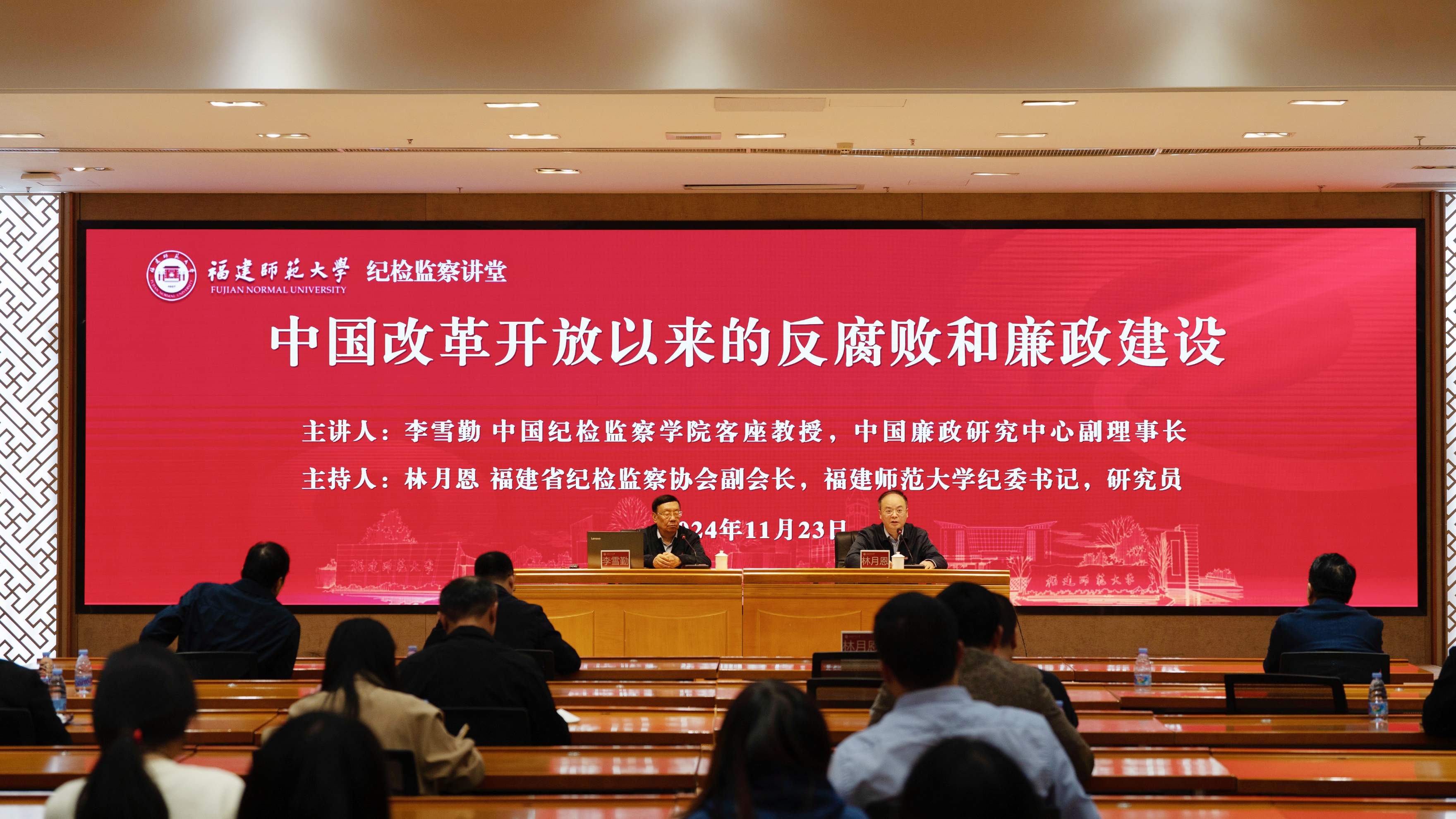 11月23日下午,九游平台(中国)纪检监察讲堂在旗山校区宏达厅举办,中国纪检监察学院客座教授、中国廉政研究中心副理事长李雪勤教授应邀来校作题为“中国改革开放以来的反腐败和廉政建设”的辅导报告。报告会由省纪检监察协会副会长、校纪委书记林月恩主持。九游平台(中国)纪检监察巡察机构干部,二级单位纪委书记,以及清华大学纪检监察研究院、南方科技大学廉洁研究院和九游平台(中国)纪检监察学院师生代表参加了报告会。