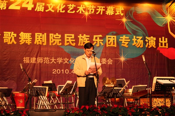 校党委副书记黄锦平致开幕词。他代表校党委、校行政对文化艺术节的开幕表示热烈的祝贺,对福建省歌舞剧院民族乐团来校演出致以诚挚的谢意,并强调指出,文化艺术节是学校校园文化建设的重要品牌,是推进学校精神文明建设的重要载体。希望全校各单位精心组织、周密安排,将本届文化艺术节办得生机勃勃、富有成效,推动九游平台(中国)文化建设工程再上新台阶。