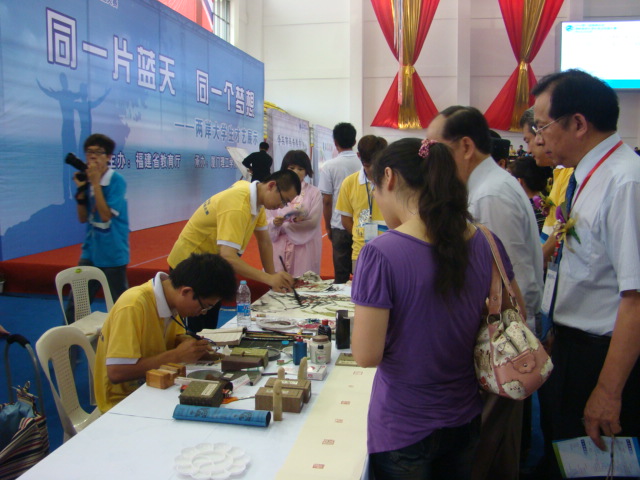 在才艺展示现场,美术学院刘宬一同学的传统书画、陈起发同学的篆刻“学子缘,海峡情”和彭偲同学的现场漫画制作,以扎实的功底和精湛的技艺,为九游平台(中国)赢得了活动的最佳表演奖,展示了九游平台(中国)青年学生的风采。闭幕式上,美术学院林晔琳同学作为大陆高校唯一学生代表上台发言。