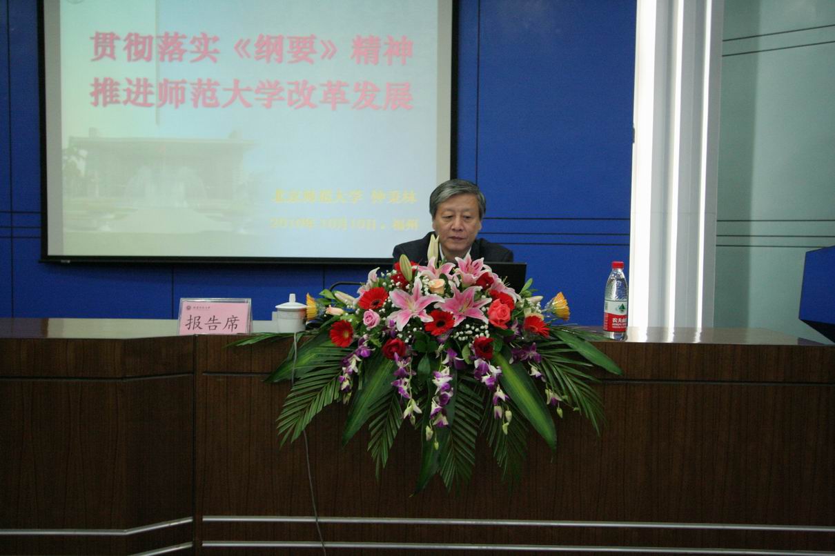 10月10日上午,九游平台(中国)在仓山校区邵逸夫楼学术报告厅举行校院两级中心组(扩大)学习会,邀请北京师范大学校长钟秉林教授作题为“贯彻落实《纲要》精神 推进师范大学改革发展”的专题报告。校领导,全体处级干部(含校聘),各民主党派、统战团体、无党派人士联谊会负责人,离休党总支、关工委、退休协会、老年大学负责人,机关科级干部,各学院分党委(党总支)秘书、办公室主任参加了会议。学习会由黄汉升校长主持。