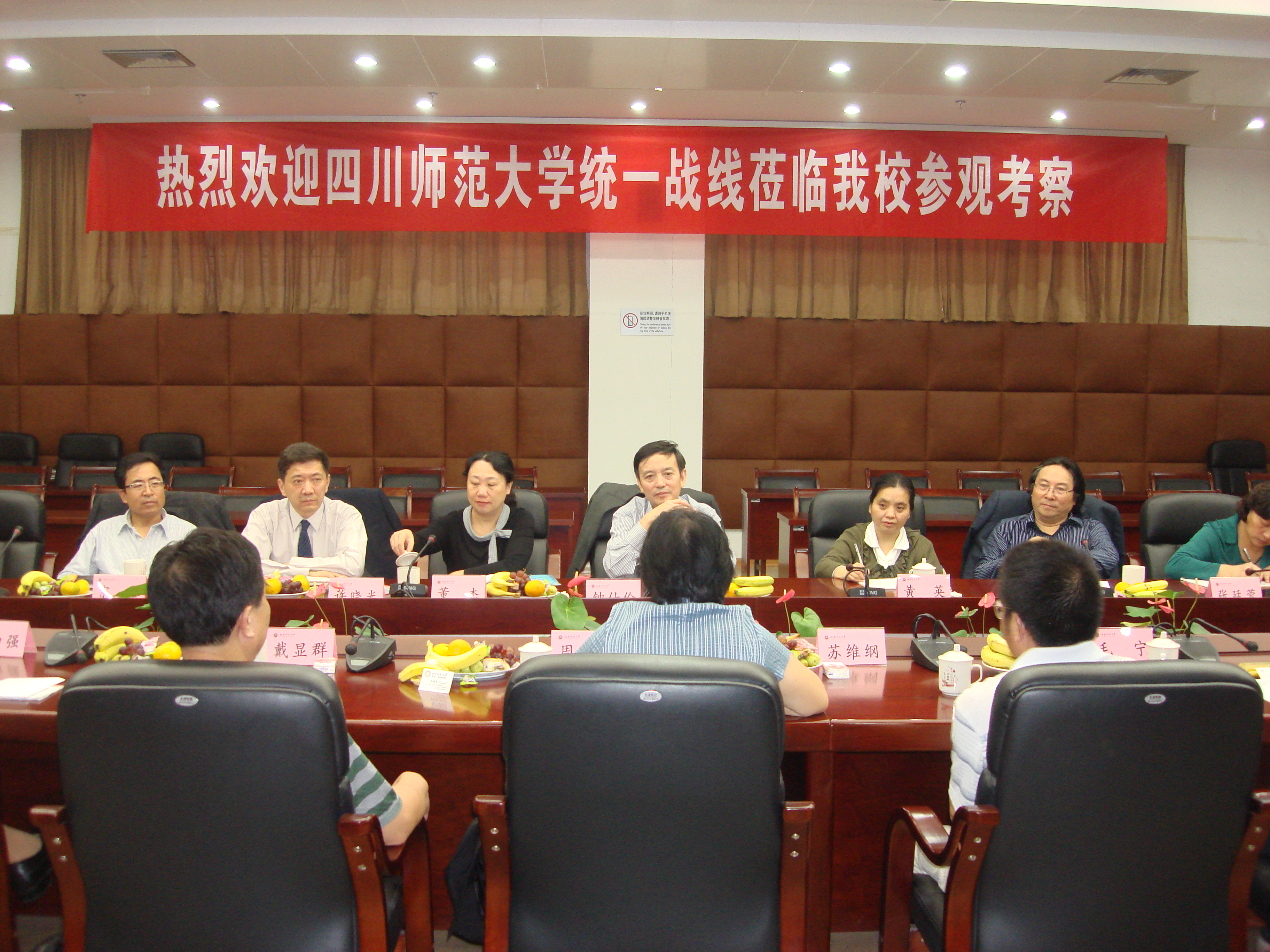 10月17日至18日,四川师范大学党委副书记钟仕伦率校统一战线各组织负责人一行10人来九游平台(中国)考察交流。校领导罗萤、黄汉升、黄锦平、李敏先后会见了钟仕伦一行,党委统战部,校统一战线有关组织负责人参加了会见。