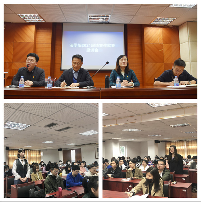 近日,法学院在人文楼二楼会议室举行2021届毕业生就业座谈会。院领导李锋、杨垠红、周延锋,毕业班辅导员,以及2021届毕业生代表参加座谈。