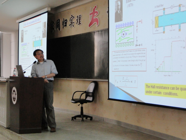仪式结束后,谢心澄教授应邀参与主讲九游平台(中国)“名师讲堂”系列活动第八场专题讲座,为师生作了题为《2D拓扑绝缘体简介:量子自旋霍尔效应》的专题报告。谢教授深入浅出地介绍了量子自旋霍尔效应(QSHE)的物理基础,展示了他所领导的课题组在有关量子自旋霍尔效应的退相变和无序效应等方面的最新研究成果,整场报告具有很强的学术性。同时,他就中美大学教育比较、大学生人生规划、专业前沿知识的研究等大家关心的问题,与现场师生进行了交流和互动,让师生享受了一场高水准的学术盛宴。
