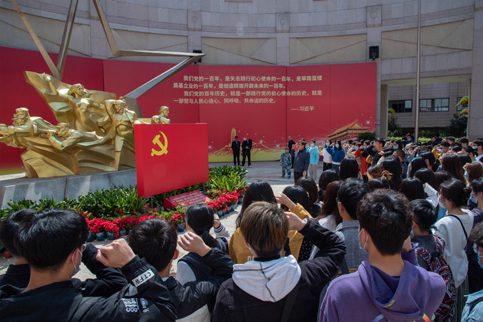 参馆后,全体师生在中心广场铜雕前重温入党誓词,深入学习领会习近平总书记在党史学习教育动员大会上的重要讲话精神,做到学史明理、学史增信、学史崇德、学史力行,学党史、悟思想、办实事、开新局。