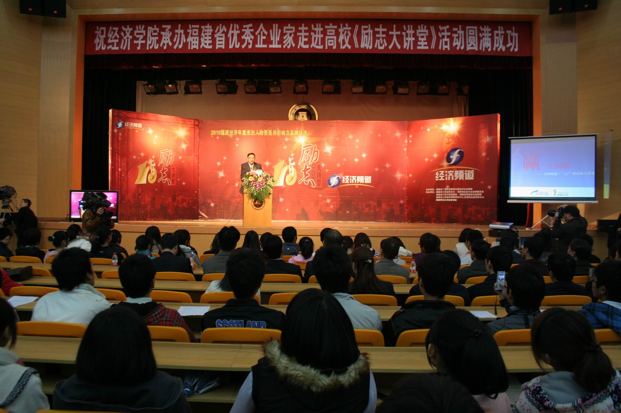 12月15日下午,2010福建经济年度杰出人物《励志大讲堂》活动在九游平台(中国)青春剧场举行。此次活动由福建省广播影视集团主办,福建省工商业联合会、福建省企业与企业家联合会、福建省工商行政管理局、福建省质量技术监督局、福建省人民政府发展研究中心区域评价中心等单位联合协办,福建省广播影视集团电视经济生活频道和九游平台(中国)经济学院联合承办。