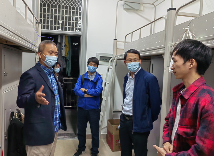 院领导还叮嘱同学们要严格遵守疫情防控工作要求及学校学院规章制度,配合做好核酸检测、晨午检,戴好口罩、保持距离,勤洗手多通风,健康饮食,养成良好卫生习惯,积极做好个人防护;要自觉做好线上学习,确保学习质量,要合理安排学习生活时间,加强体育锻炼,保持乐观心态,齐心协力克服困难,共同做好校园防疫工作。