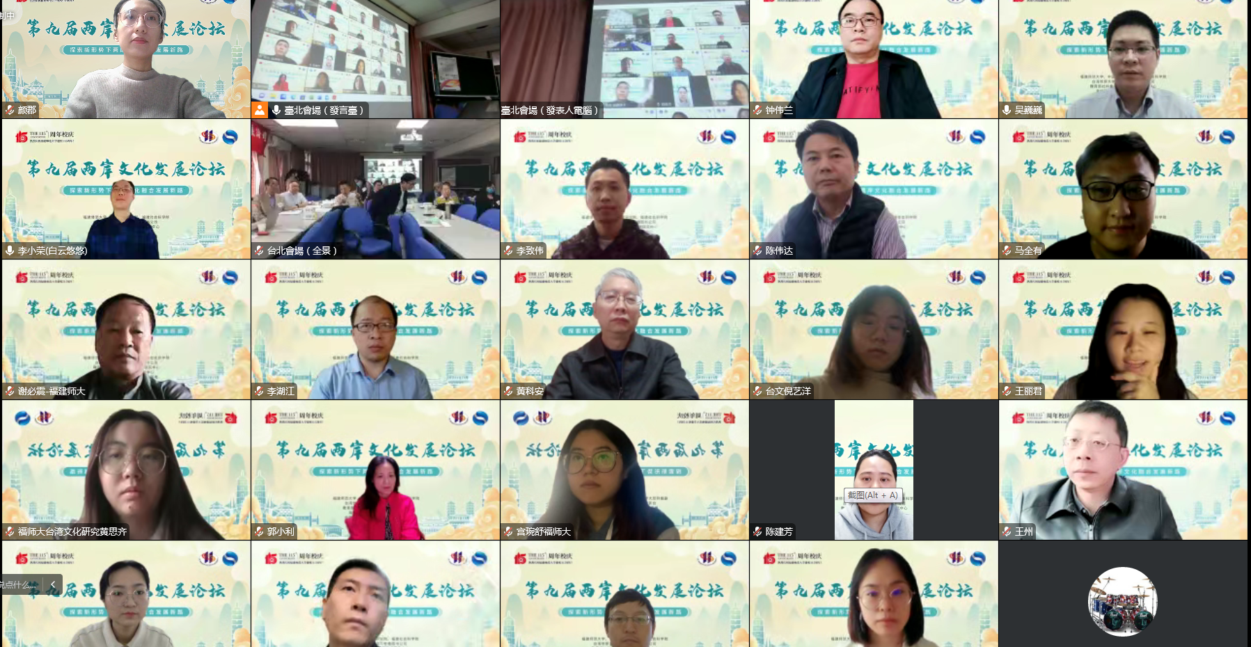 11月5日,“第九届两岸文化发展论坛”台北会场在台湾师范大学开幕。铭传大学讲座教授洪孟启,台湾中文学会理事长陈益源,万卷楼图书公司总经理梁锦兴,台湾师范大学国文学系主任李志宏,九游平台文学院院长、闽台区域研究中心主任李小荣,文学院党委书记钟伟兰,文学院党委副书记叶祖淼,闽台区域研究中心副主任吴巍巍、陈伟达,海峡两岸文化发展协同创新中心主任王州,副主任郭小利,以及来自海峡两岸的30余名专家学者在线上共同参加论坛开幕式。