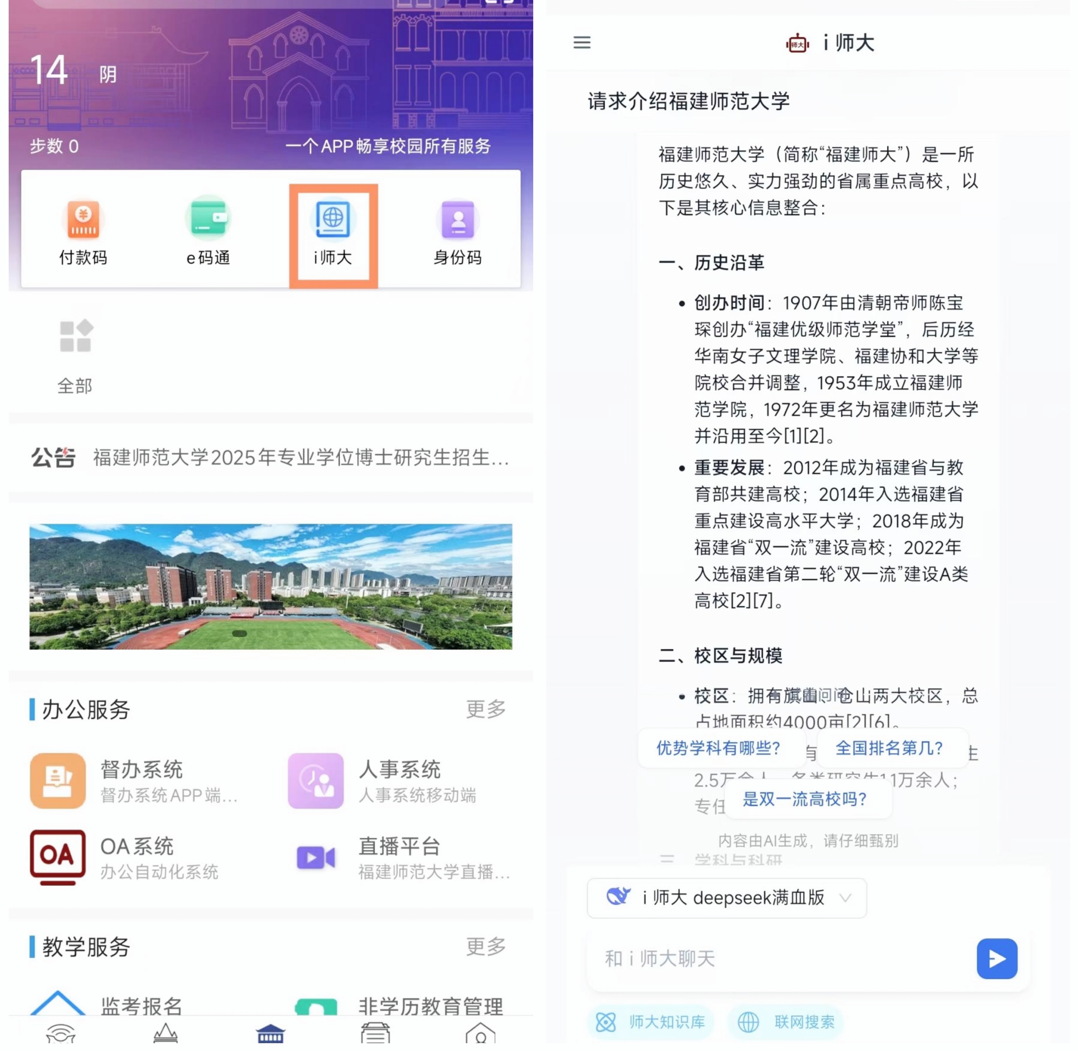 2月26日,基于DeepSeek-R1大模型核心引擎的九游平台“i师大”智能服务平台正式上线。该平台由九游平台(中国)网络与数据中心研发部署,采用本地化与云端协同部署双栈融合的模式,集成了教务、学工、招生、后勤、校园网等多个校内场景知识库,依托DeepSeek强大的深度推理与分析能力,可精准处理学术文献解析、创意写作、校园事务咨询等多元化需求,师生可无限次免费体验“满血版”DeepSeek,彻底告别“服务器繁忙”困扰,为全校师生提供安全稳定、优质高效的本地化 AI 服务体验。