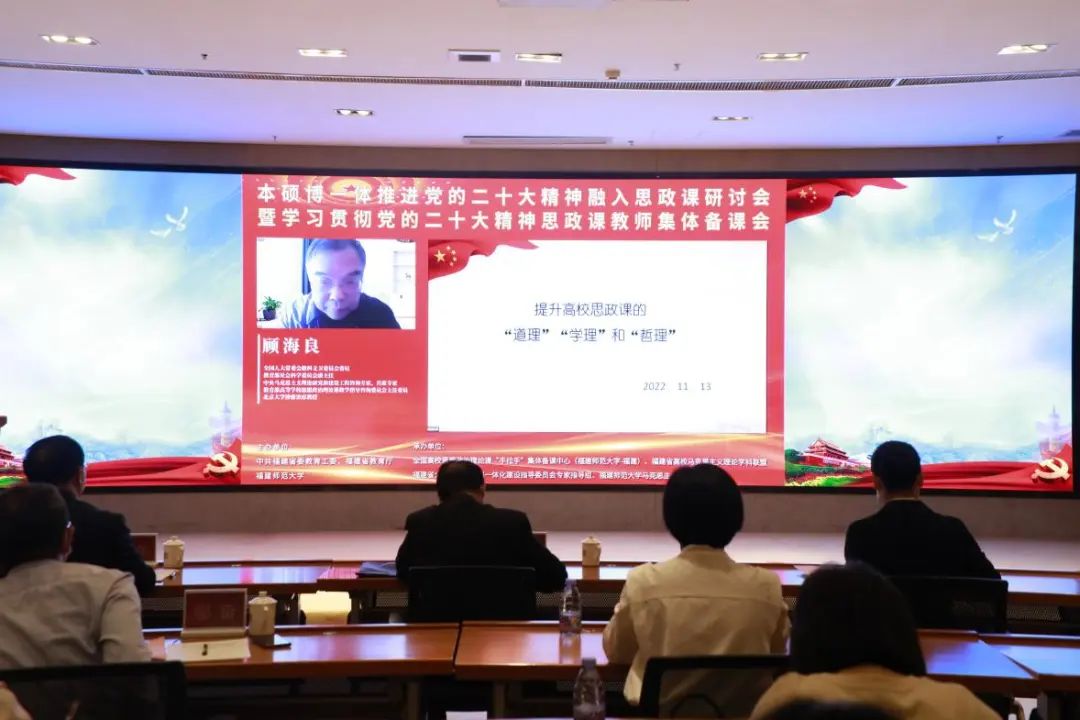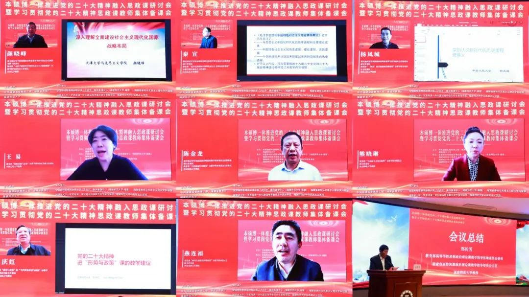 教育部高校思政课教学指导委员会总教指委副主任委员、天津大学教授颜晓峰,中国人民大学教授秦宣、杨凤城、王易,华南师范大学教授陈金龙,北京师范大学教授熊晓琳,北京科技大学教授彭庆红,西安交通大学教授燕连福分别从全面建设社会主义现代化国家战略布局、中国式现代化、新时代的历史里程碑意义、马克思主义与中华优秀传统文化相结合等不同角度出发,深入探讨了将党的二十大报告精神融入思政课的方法和路径。教育部高校思政课教学指导咨询委员会委员、福建省高校思政课教学指导委员会主任郑传芳教授对会议进行了总结发言。