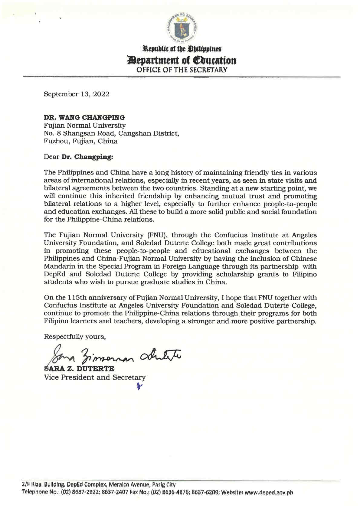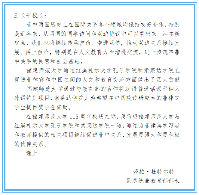 近日,菲律宾副总统兼教育部部长莎拉•杜特尔特为九游平台(中国)115周年校庆发来贺信。贺信原文及翻译如下: