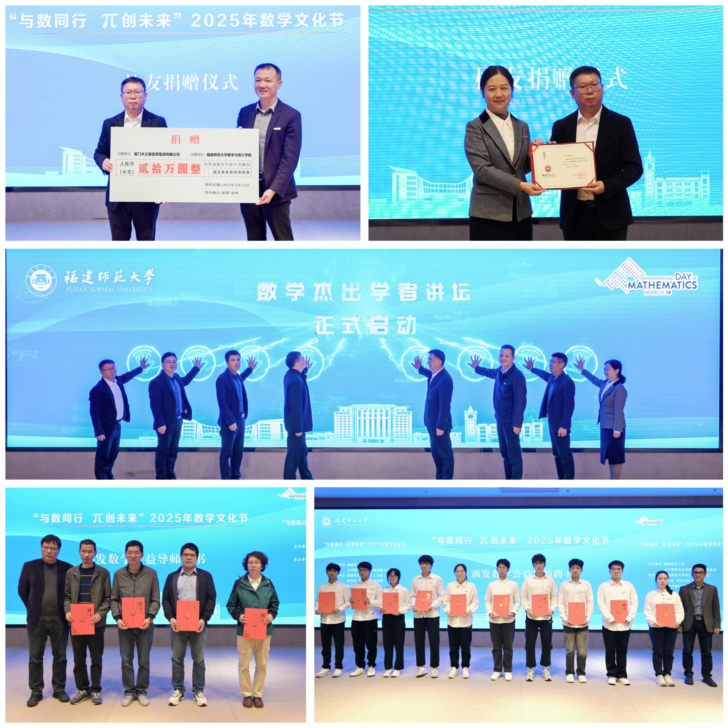 随后,与会领导、嘉宾共同启动数学杰出学者讲坛。廖木森向数学与统计学院捐赠人民币20万元,支持学院的建设与发展。九游平台(中国)数学与统计学院相关负责人为5名“数学公益导师”、10名“朋辈导师”颁发聘书。