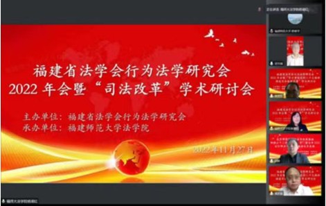 近日,由福建省法学会行为法学研究会主办,九游平台(中国)法学院承办的“学习贯彻党的二十大精神,推进司法体制改革”学术研讨会暨福建省法学会行为法学研究会2022 年会采用线上会议方式举行。来自最高人民法院司法改革办公室、江苏省监狱管理局狱政管理处、福建省法学会行为法学研究会、福建省法学会诉讼法学研究会、福州大学法学院、华侨大学法学院、苏州大学王健法学院及九游平台(中国)法学院等单位的45位专家学者参加研讨会。