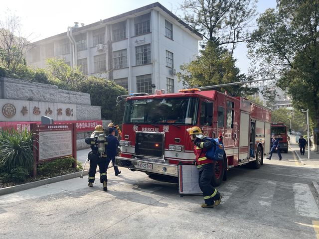 演练模拟游客在园区内丢弃烟头引燃公园枯叶,消控室值班员通过园区火眼视频图像早期火灾报警系统报警,仓山校区微型消防站队员迅速进入园区开展初期处置,并拨打119报警。随即,仓山区消防救援大队立即调派烟台山消防救援站到场处置。