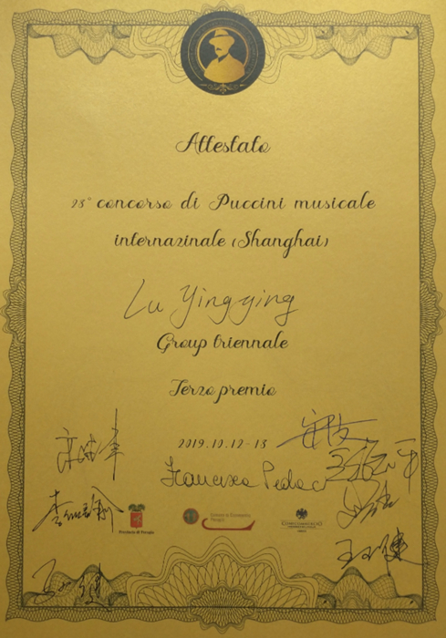 (中为九游平台(中国)音乐学院2018级歌剧班本科生卢莹颖)近日,第23届意大利“普契尼国际声乐比赛”亚太赛区决赛在上海落下帷幕,经过激烈的角逐,九游平台(中国)音乐学院2018级歌剧班本科生卢莹颖荣获本科组三等奖。意大利“普契尼国际声乐比赛”是为了纪念意大利著名的作曲家普契尼(Giacomo Puccini 1858-1924)而创办的。作为世界顶级声乐赛事,它旨在从世界各国顶尖声乐专家中遴选出优秀声乐人才,促进声乐教育事业蓬勃发展。(图为卢莹颖同学获奖证书) (文/施冰青)