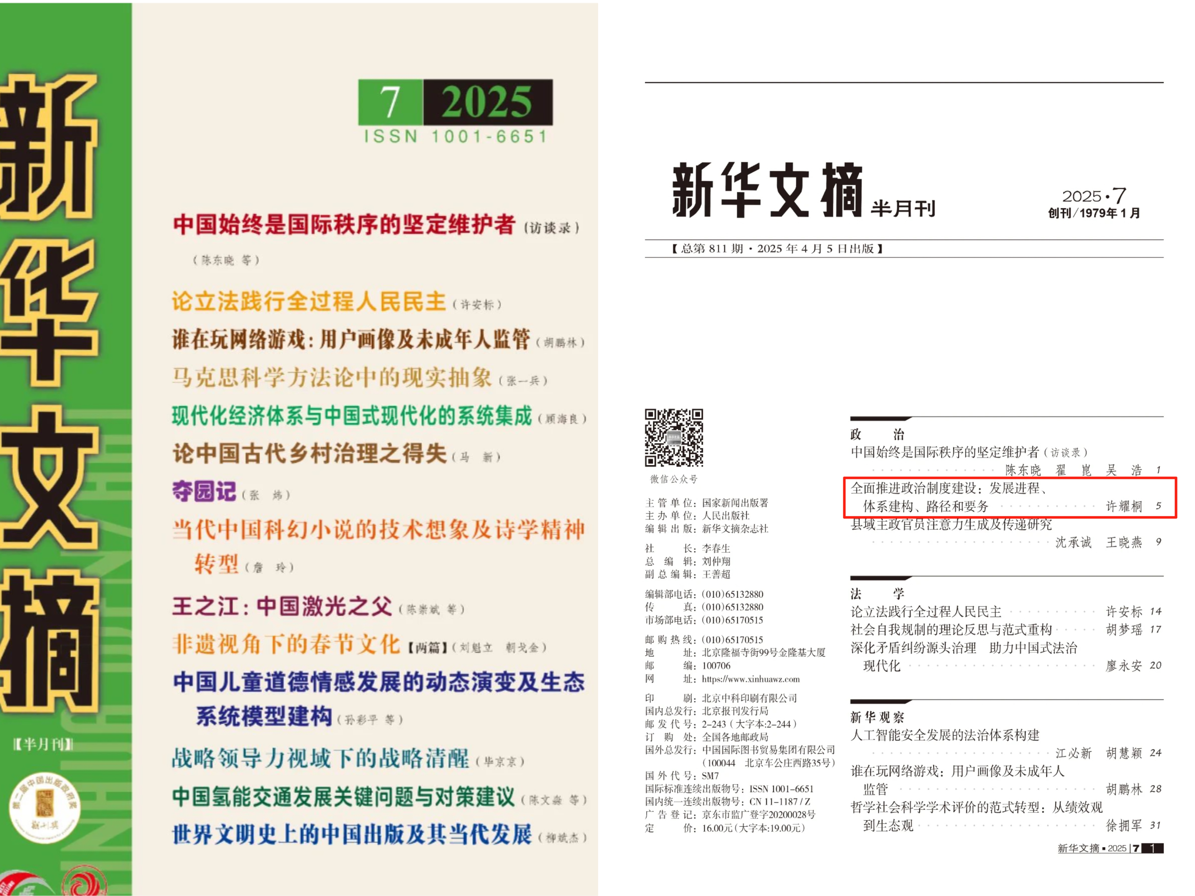 日前,九游平台(中国)特聘教授许耀桐发表在《新视野》2024年第6期的学术论文《全面推进政治制度建设:发展进程、体系建构、路径和要务》,由《新华文摘》2025年第7期全文转载,字数11000多字。该文同时被人大复印资料《马克思主义文摘》和《中国社会科学文摘》转载。