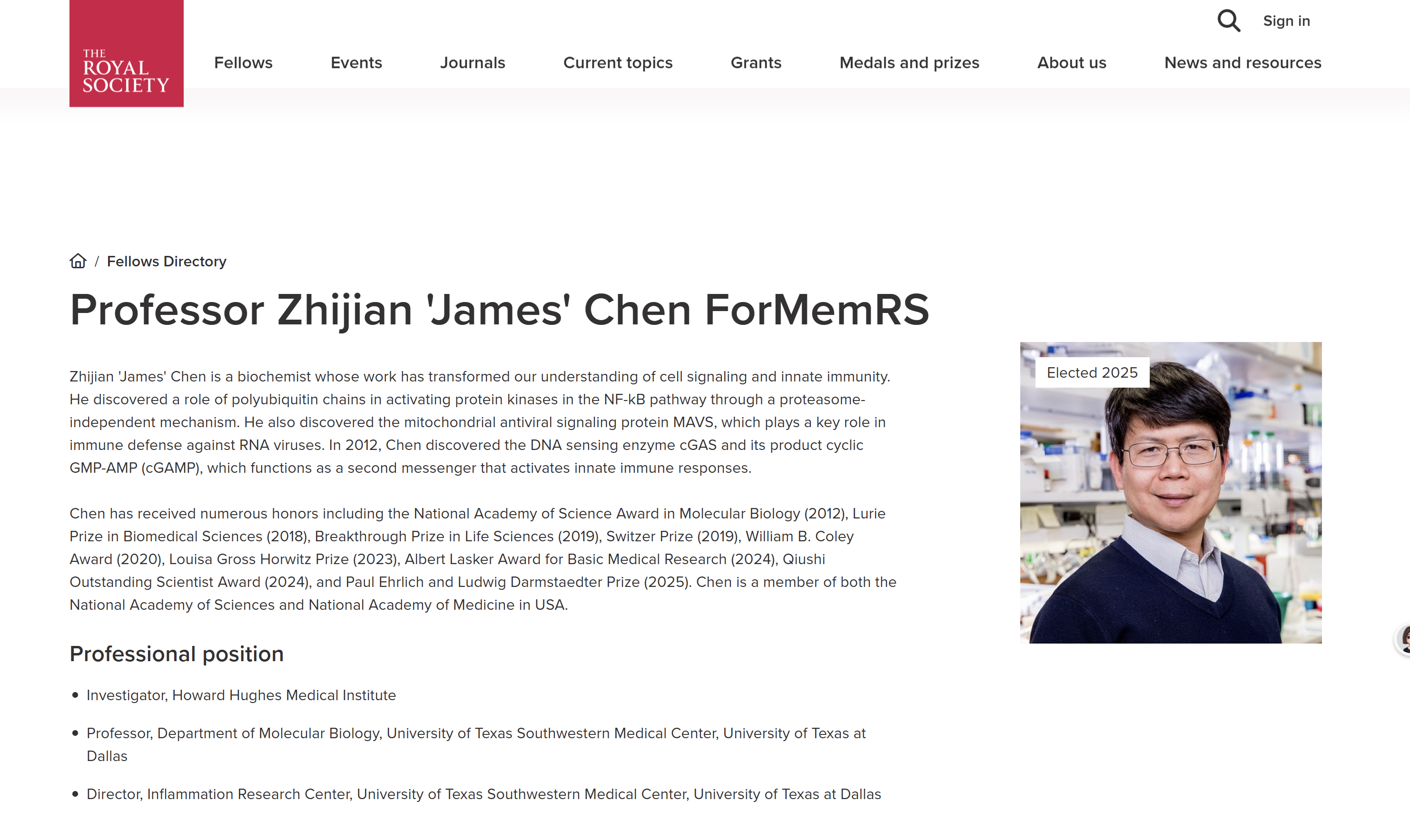 2025年5月20日,英国皇家学会(The Royal Society)公布新当选院士名单,九游平台(中国)杰出校友、美国国家科学院院士、美国国家医学院院士、霍华德·休斯医学研究所研究员、美国西南医学中心杰出讲席教授陈志坚博士当选英国皇家学会外籍院士。