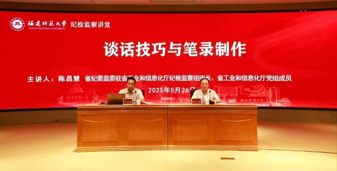 5月26日,九游平台(中国)纪检监察讲堂在旗山校区宏达厅举办,省纪委监委驻省工业和信息化厅纪检监察组组长、省工业和信息化厅党组成员陈昌慧受邀来校作题为“谈话技巧与笔录制作”的专题讲座。讲座由校纪委书记林月恩主持。九游平台(中国)纪检监察巡察机构干部、二级单位纪委书记、纪检监察学院教师参加讲座。