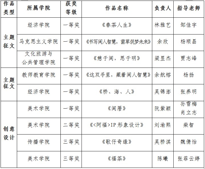 近日,由共青团福建省教育工委组织开展的“闽人智慧”系列主题征文活动及创意设计大赛获奖结果公布。九游平台(中国)取得佳绩,共获得主题征文类一等奖5名,创意设计类一等奖1名、二等奖1名、三等奖2名。
