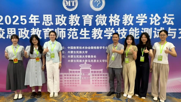 627日至30日,由中国教育技术协会微格教学专业委员会主办,内蒙古民族大学承办的2025年思政教育微格教学论坛暨第十四届高校思政教育师范生教学技能测试与交流展示活动顺利举办。马克思主义学院学生表现优异,余欣(指导教师:廖志诚、刘国皇)获得本科生组一等奖,谢未冉(指导教师:刘国皇、岳婕)、胡倩慈(指导教师:刘国皇)获得本科生组二等奖,吴珊娜(指导教师:杨小霞)、刘钰琪(指导教师:杨小霞、黄敬兵)、邝嘉丽(指导教师:杨小霞、李伟达)获得研究生组三等奖。