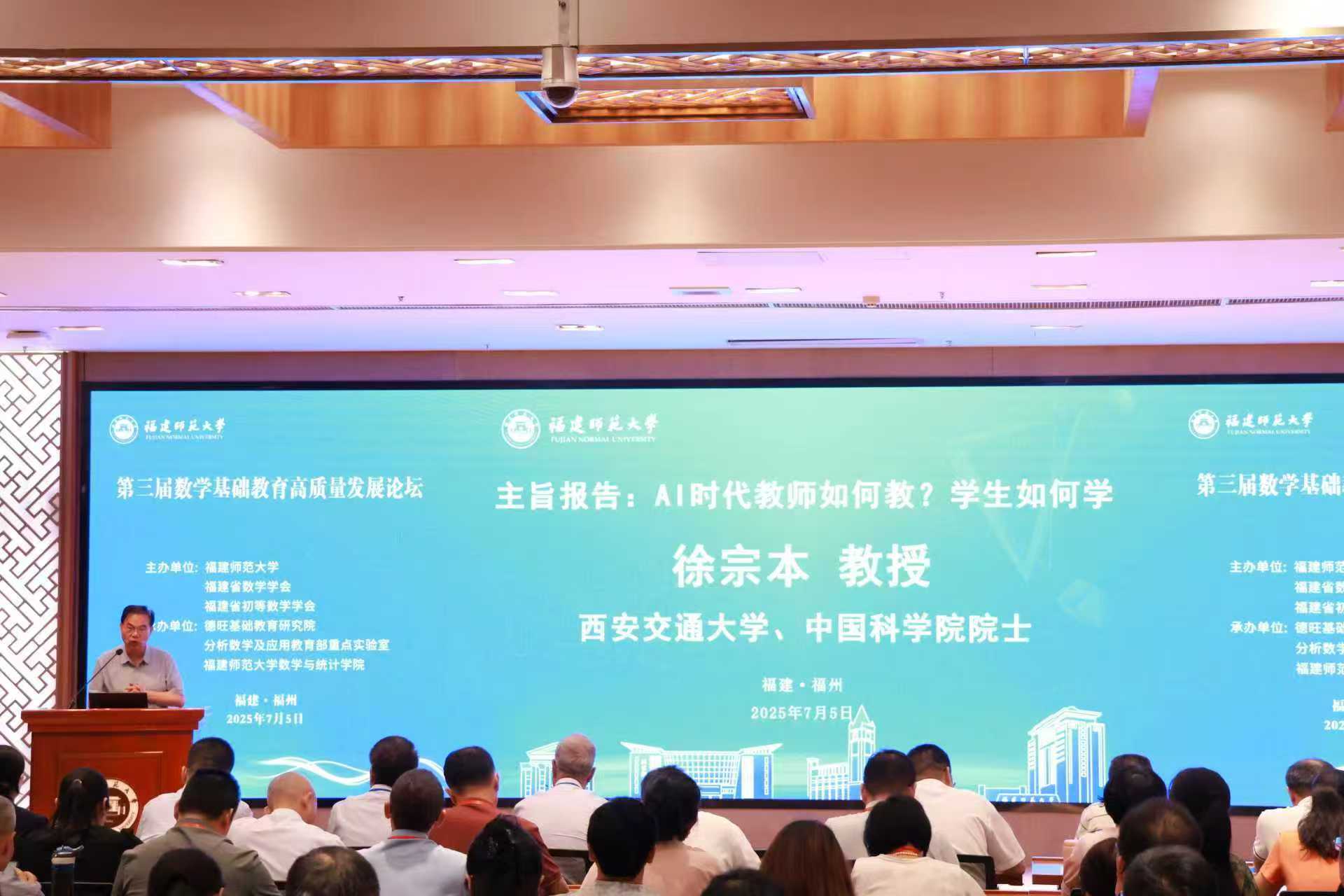 会议特别邀请中国科学院院士、西安交通大学徐宗本教授作主旨报告,报告由分析数学及应用教育部重点实验室主任、九游平台(中国)原校长王长平教授主持。报告中,徐宗本院士以《AI时代教师如何教?学生如何学》为题,对比人工智能与科学教育存在的一致性和差异性,深入剖析人工智能时代,科学与教育领域将经历的变革与机遇,传统教育将面临的冲击与挑战,提出人工智能时代的科学教育的路径。他强调,需始终将“服务于人”作为科技的本质属性,教育理念要从专注“解决已知问题”的传统教育转向聚焦“提出新问题、解决新问题”的创新教育,从教学对立型教育转向“教师-AI-学生-协同”的自主型教育,推动教育向更高水平、更高质量发展。