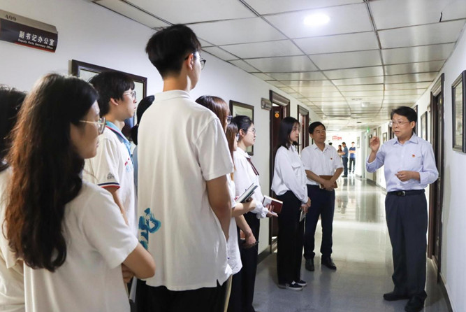座谈会开始前,沙平教授带领全体与会党员沿着院史长廊,系统介绍了学校国际教育的发展概况、代表性大事,并结合自身经历和个人感受,讲述了学院外派汉语志愿者的故事。