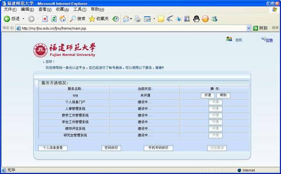 登录统一身份认证平台后,界面下方有一组按钮,分别是【个人信息查看】、【密码修改】、【手机号码修改】等,可进行个人帐户信息查看和相关更改操作。