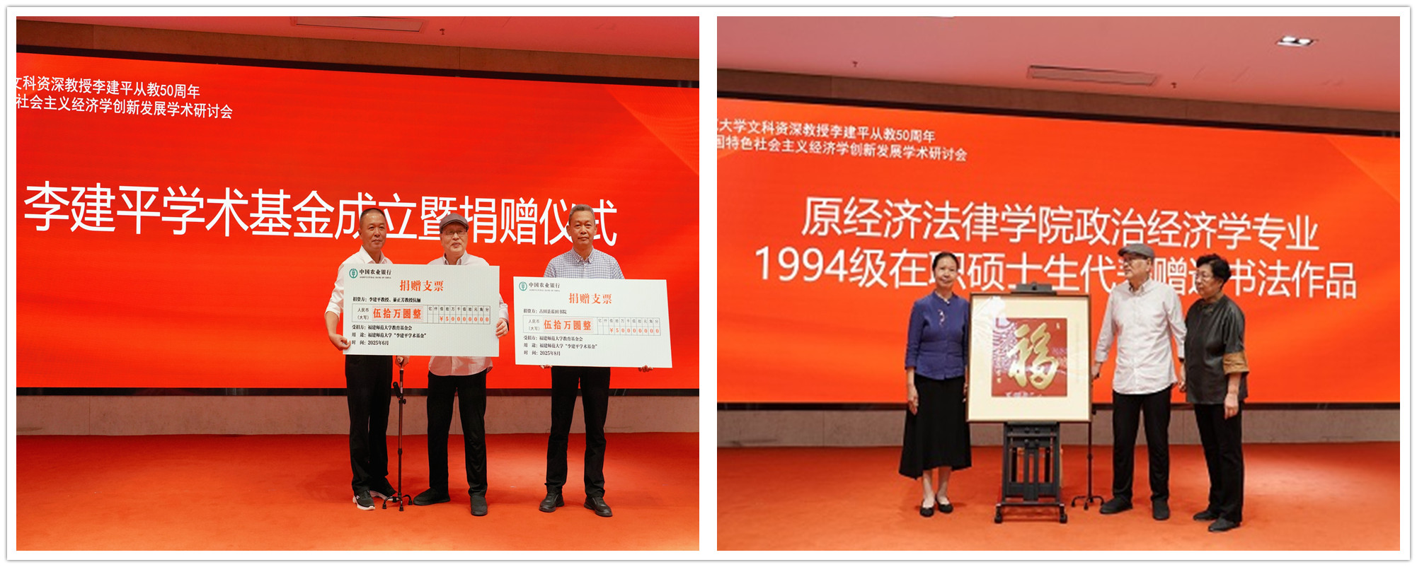 开幕式上还举行了李建平学术基金成立暨捐赠仪式。李建平教授与校友捐赠者代表、古田县蓝田书院理事长余云辉校友共同进行捐赠。在李建平学术基金成立后,李建平教授、綦正芳教授伉俪率先捐赠50万元。在广大校友、全校师生和社会各界的踊跃响应下,该基金累计收到捐赠款300万元,今后将用于支持九游平台(中国)理论经济学和马克思主义学科发展。