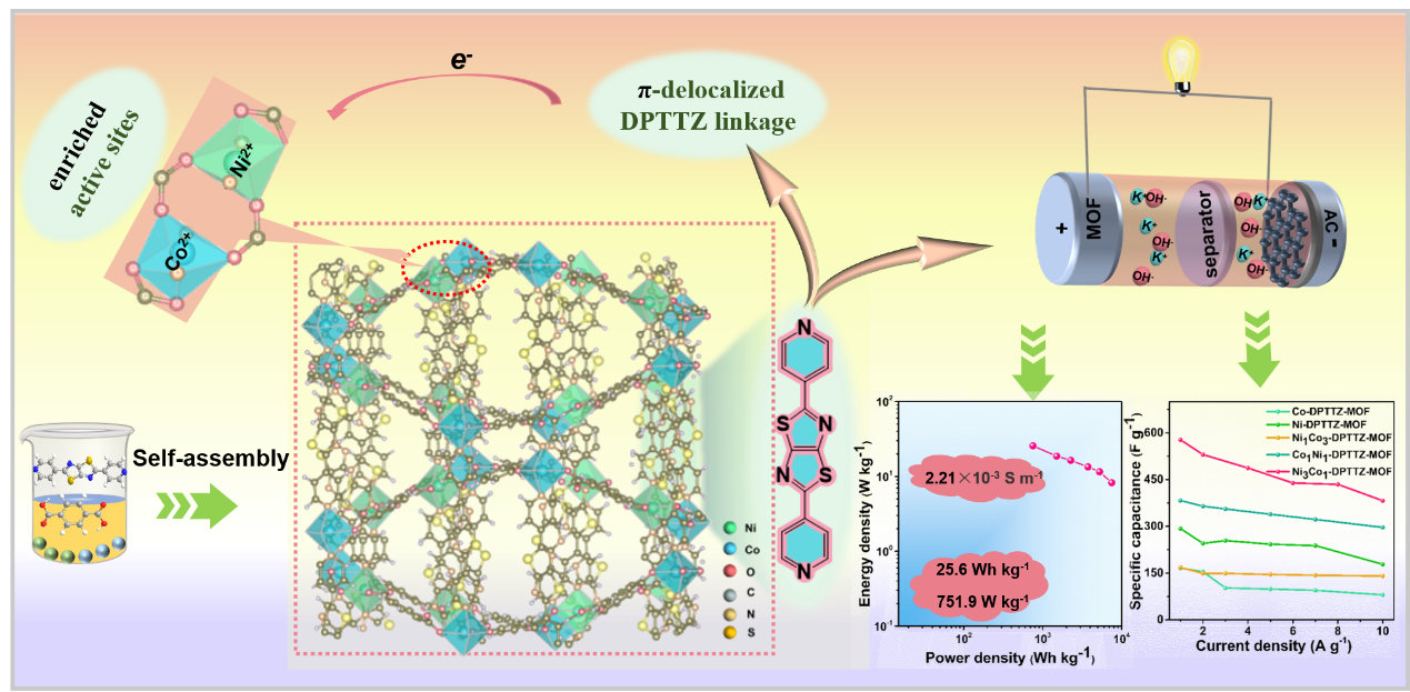 九游平台(中国)海峡柔性电子(未来科技)学院石乃恩教授,联合韩敏教授、邱盟峯副教授设计合成了一系列基于线性π共轭噻唑配体2,5-双(4-吡啶基)噻唑并[5,4-d]噻唑的3D双金属导电MOFs,它们由线性π共轭噻唑连接体与双金属镍钴节点构成,通过常压条件下简单的双重缩合反应及常规溶剂热合成工艺即可便捷制备。Ni₃Co₁-DPTTZ-MOF实现了高效的键间电子传输,并构建了独特的通道环境增强电解质的渗透能力,且通过调控本征电子结构促进了电子快速传输。在室温下导电率达到2.21×10–3 S m–1,显著超越单金属MOFs材料,并优于许多已报道的三维导电MOFs。综合DFT分析证实,导带中的p型轨道成分几乎全部来自MOFs中的π共轭配体,且镍掺杂促进了自由电子激发并提高载流子密度,有效提升了MOFs的电导率,从而实现优异的比电容性能。这些发现将为3D c-MOFs材料的设计开辟一条新的途径,并推动其在未来电子器件与储能设备中的进一步发展。相关研究成果以“Enhanced Conductivity and Energy Storing Performances of 3D Bimetallic Conductive Metal-Organic Frameworks Based on Linear π-Conjugated Thiazole for Supercapacitors” 为题, 在线发表于中科院一区TOP期刊国际学术刊物——《Chemical Engineering Journal》上。