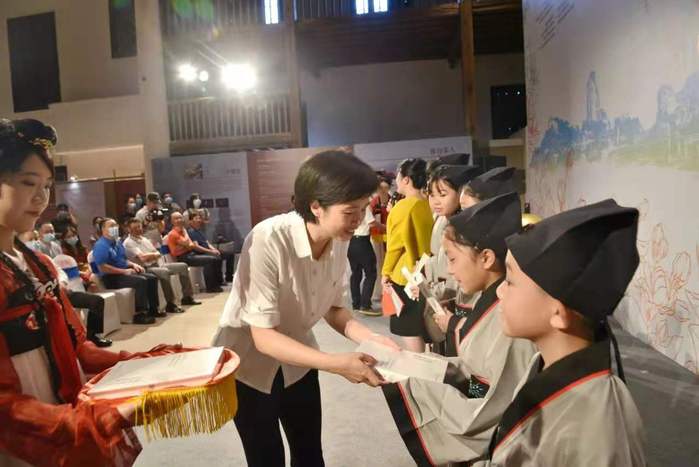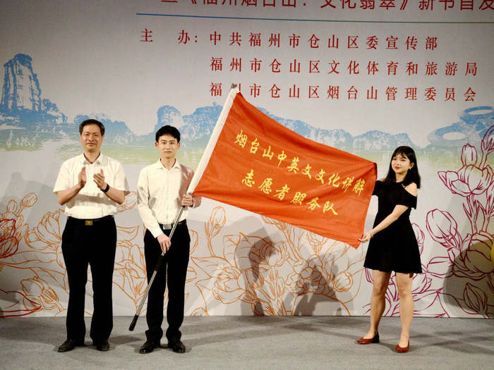 仓山区委常委、宣传部长李亦仁与外国语学院党委书记章琳为仓山区麦浦小学、永泰县嵩口小学等乡村学校的学生代表赠书。仓山区委副书记、代区长刘用全为由九游平台(中国)外国语学院学生组成的烟台山中英文讲解志愿队授旗。讲解志愿队成员吴玉清同学用英文熟练介绍烟台山。随后,仓山区委书记郑子记宣布邀请展开幕。