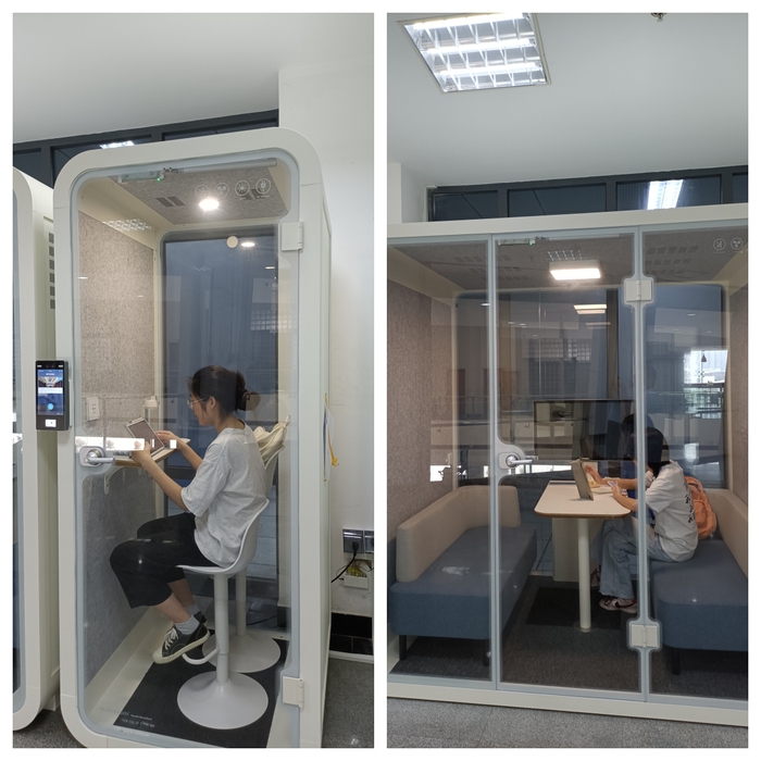 近日,图书馆上线全新空间——静音舱。不同于传统自习室,静音舱内部配备了隔音材料,具有良好的隔音效果,可以减少外界噪音的干扰,营造安静、舒适的学习环境,使读者更加专注地阅读和学习。