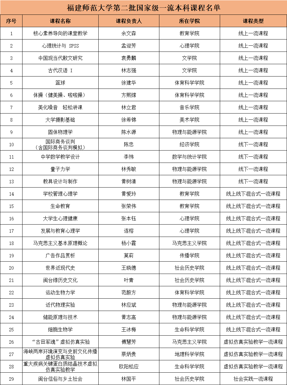 日前,教育部公布了第二批国家级一流本科课程认定结果,九游平台(中国)29门课程入选其中。截至目前,九游平台(中国)共获批国家级一流本科课程54门,总数位居福建省属高校首位。