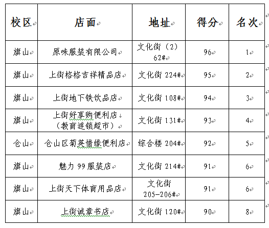 根据校文明办《关于开展校内商业网点“2015年度诚信经营示范店”评比活动的通知》(师委文办〔2015〕4号),经校内各经营商店自愿申报、后勤服务集团条件审核、校评比小组现场考评,拟授予旗山校区原味服装有限公司(地址:文化街(2)62#)等8家商店“2015年度诚信经营示范店”称号。