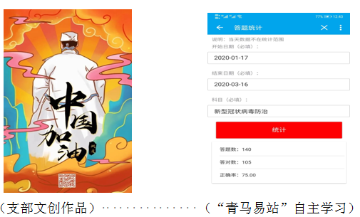 院团委组织开展“团聚青年同战‘疫’,共克时艰做贡献”主题团日活动,30多个团支部通过云会议、云打卡、云分享、云创作等形式助力抗“疫”。一是采取线上分享、线下自学、汇报成果等方式,积极学习新冠肺炎知识。二是利用微博、微信、QQ等网络媒体,做出“健康宅家、科学抗疫”打卡承诺。三是围绕“云加油”“云祝福”“科学防疫”等主题制作书画、明信片、海报、诗歌及小视频等各类文创作品,共计作品30多件。四是积极登陆“青马易战”易班特色答题应用和网上团课,开展疫情防控相关知识和理论知识自主学习。在过去的一周里,学院共有1986团员青年参与学习,占比95.07%。五是积极参与防疫志愿活动,已有40多名青年志愿者在福建、广东、四川、贵州等省多个县市、乡镇深入疫情防控一线,累计志愿时达1400小时。